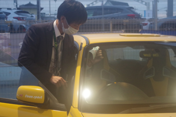 車検標章の貼り付けをお願いしたところ、こうして快く引き受けて下さいました。