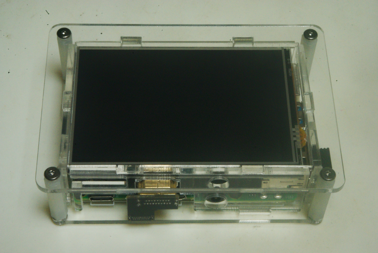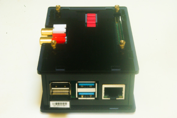 Raspberry Pi 4 model B + inno HIFI DAC module I2S インターフェース ネットストリーム オーディオ プレーヤー を、まさにそのフォルムから格納されている内容物のパフォーマンスが推察されるような美しい機能的な黒色半透明の所謂ダークスモークカラーの、ただアクリルパネルを組み合わせただけのシンプルかつとても美しいその中に収まる