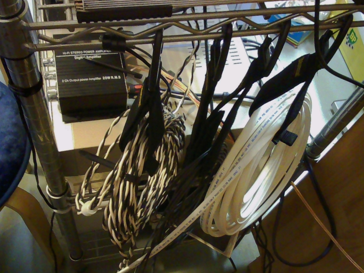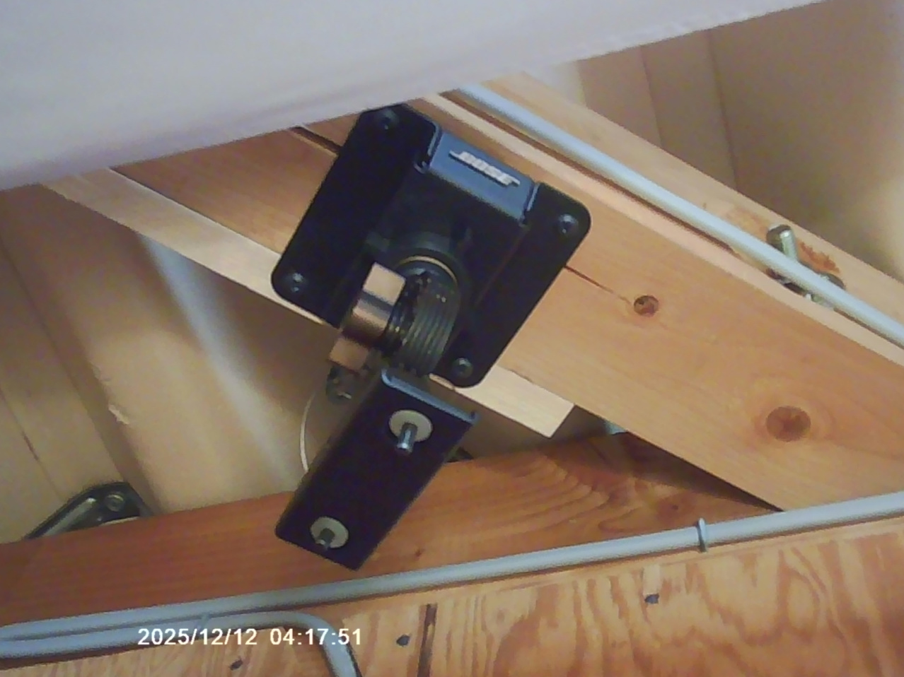 そしてスピーカーケーブルのBOSE 101VMスピーカー本体裏側のスピーカー入力バネ式端子への接続も終わり、ケーブルのガレージ壁等への引き回しと固定作業も終了したときの様子を撮影したのが左の画像です。