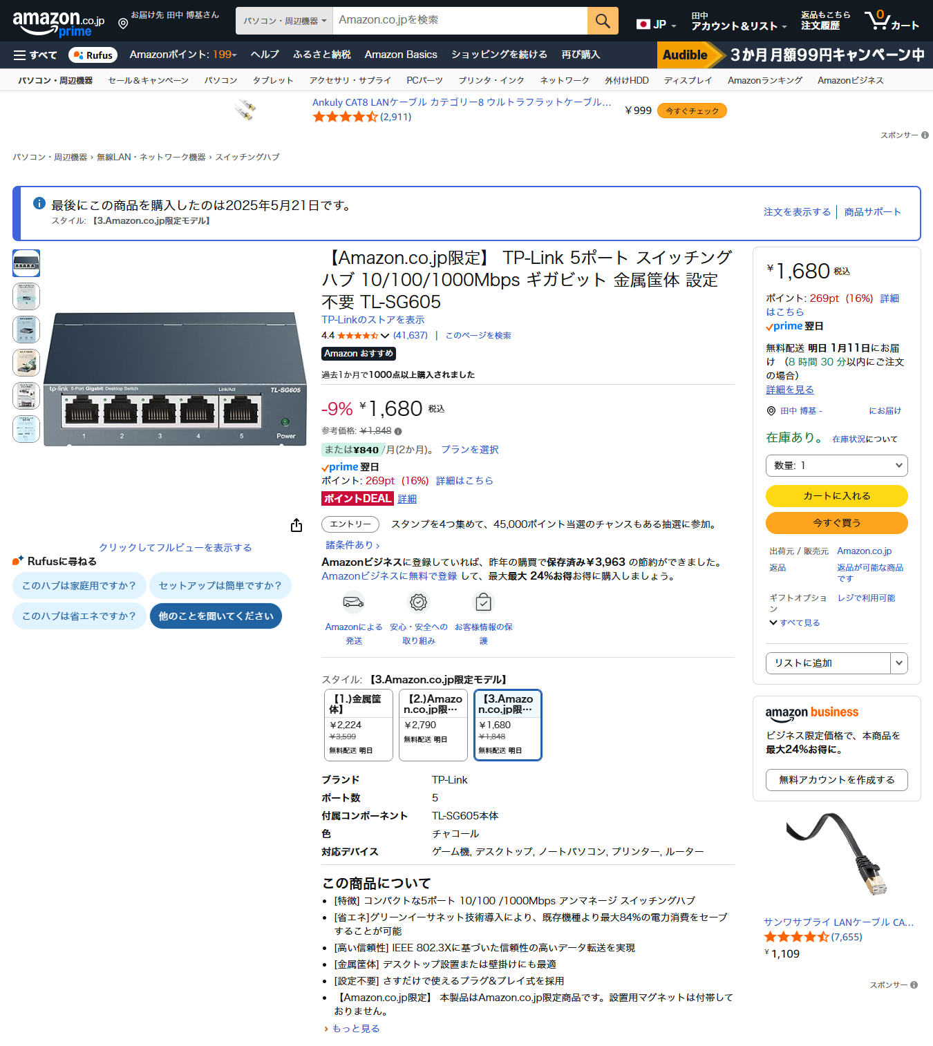 上記のスイッチングハブが左のTP-Link 5ポート スイッチングハブ 10/100/1000Mbps ギガビット 金属筺体 設定不要 TL-SG605です。