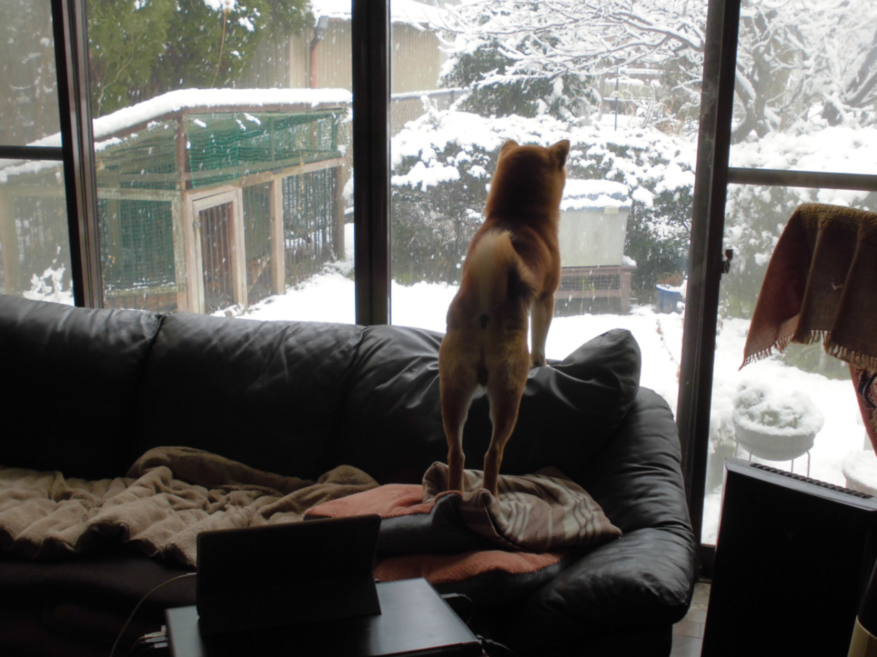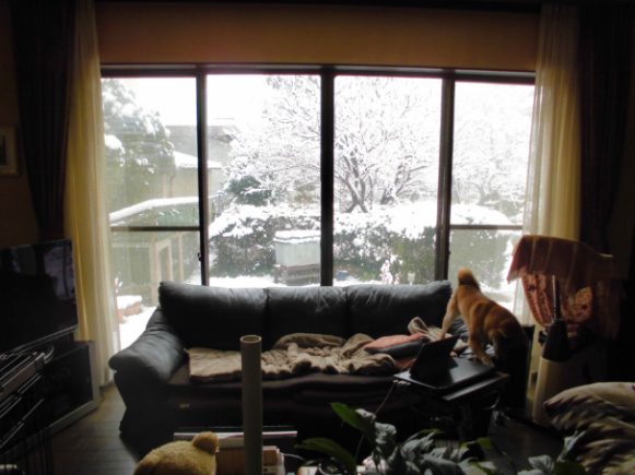 居間の窓から庭の雪景色を眺めるのもまた乙なものです。