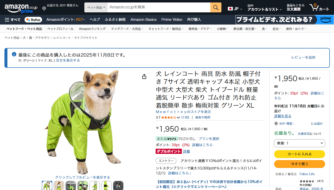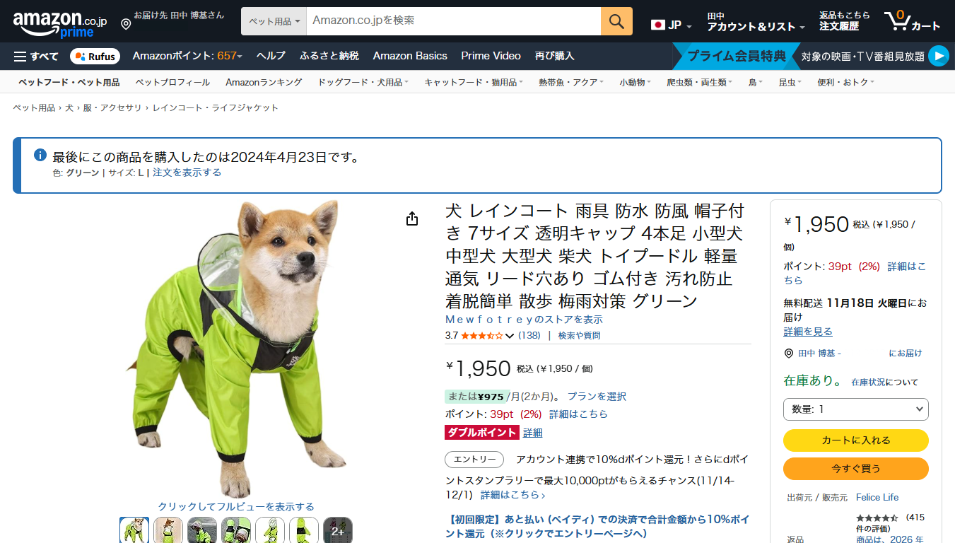 カッパも着慣れて半年以上(生後1年2ヶ月)が経ちました。