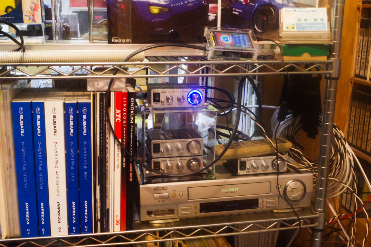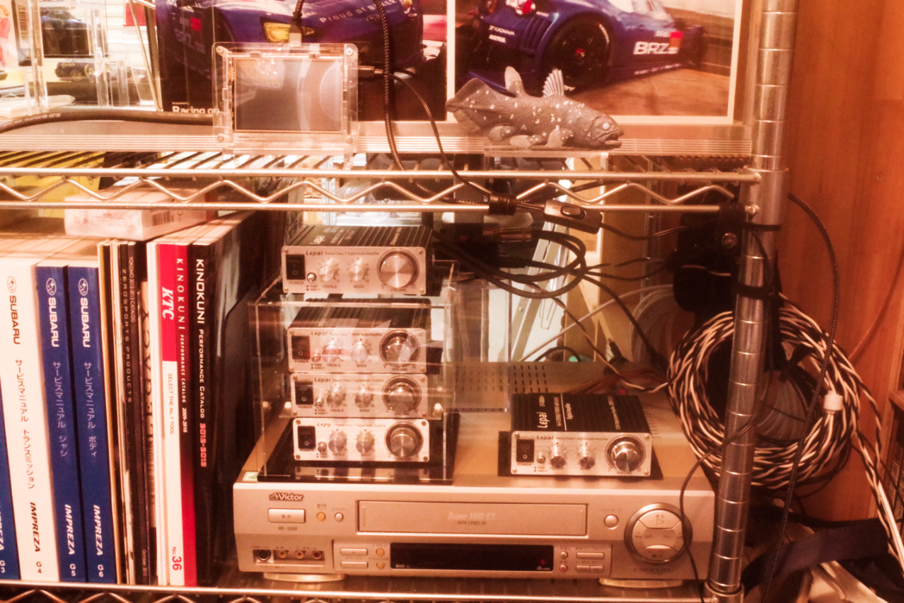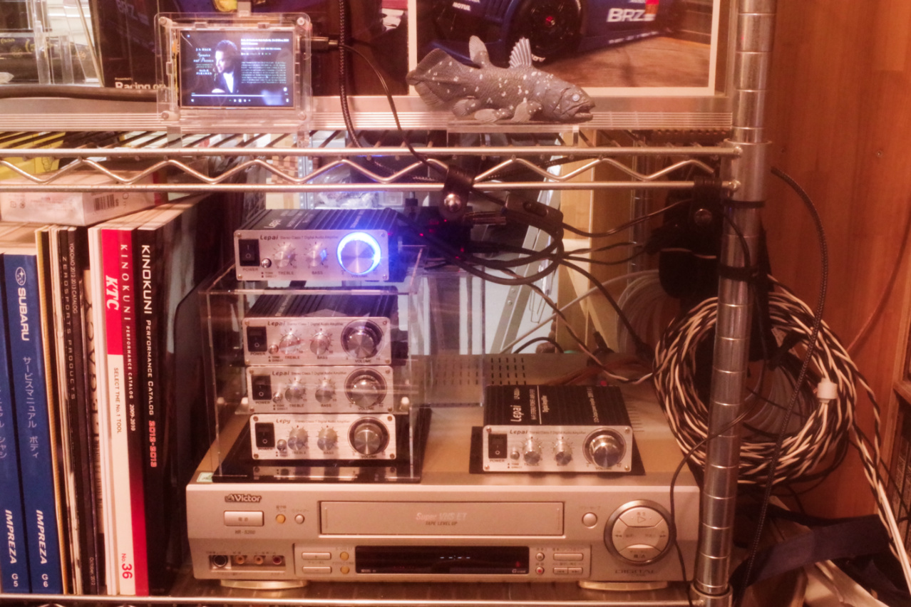 そしてその向かって右上には、VHSビデオ音声再生専用のパワーアンプとして、Lepai LP-2020A+ 新型武漢標準モデルが見えます (因みにこのアンプは一番最初にヤフオクで落札入手したLepai LP-2020A+)。