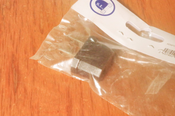 小荷物の大きな袋と中のやはりかなり大きめの段ボール箱を開梱すると、ユーロ仕様電源プラグをOタイプに変換するアダプターと、ユーロから日本仕様に変換するアダプターの2種類が、それぞれバラバラに段ボール箱に入れてありました。