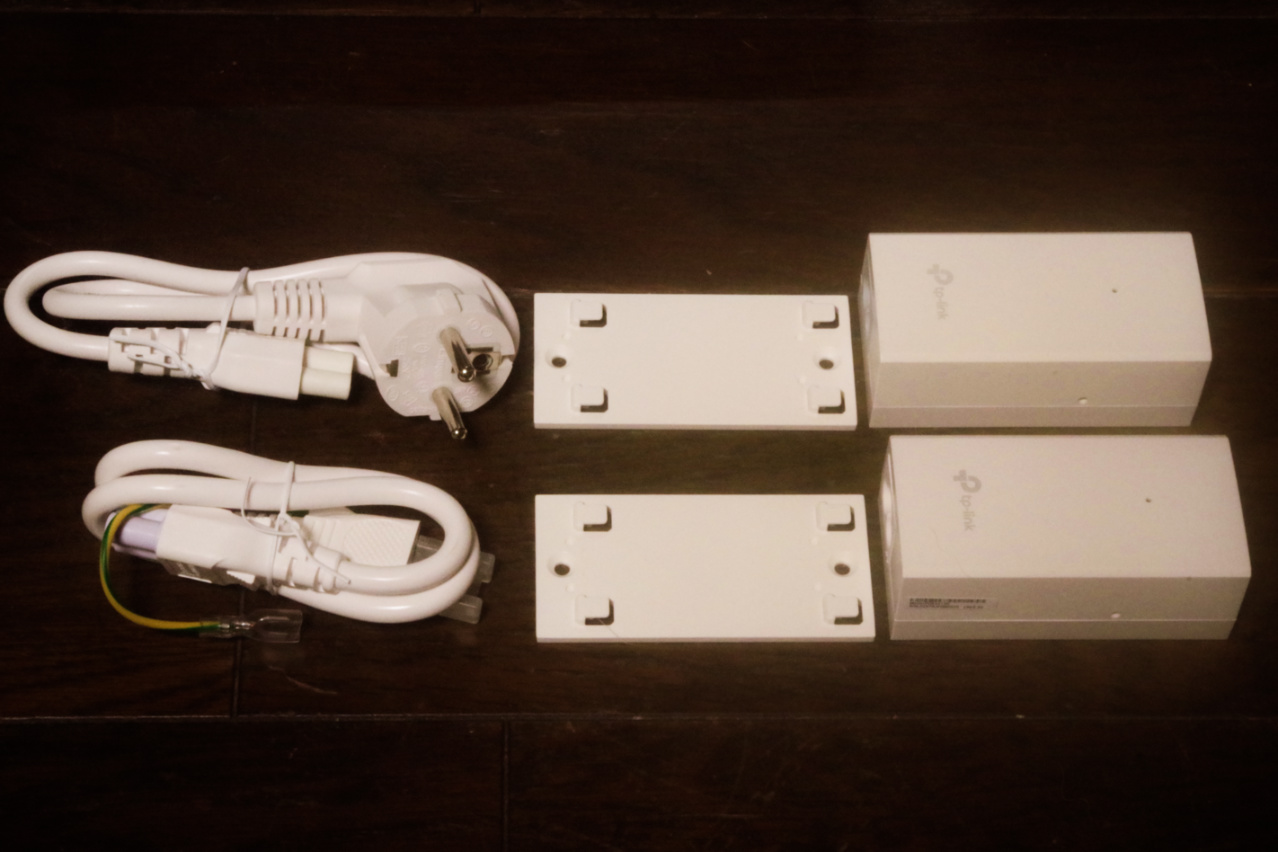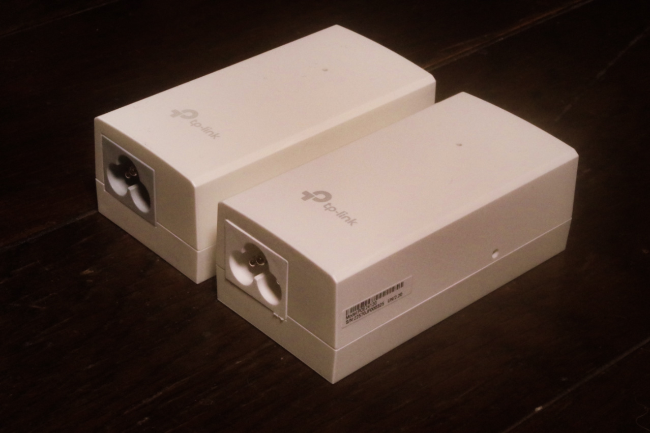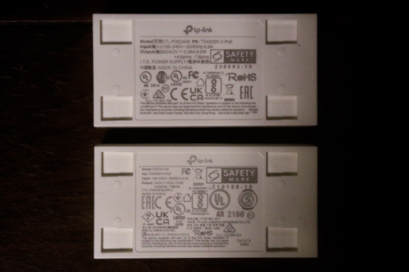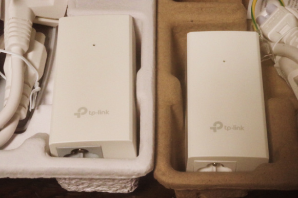 それは向こう側、TP‑Link EAP110 Access Pointの付属品のPoE給電アダプターの、電源入力部の樹脂製ユニットの色が、手前のTP‑LinkTL-POE2412G(UN) 24V Passive PoE Adapterの白色に比して、明らかにグレーカラーなのが見て取れます。