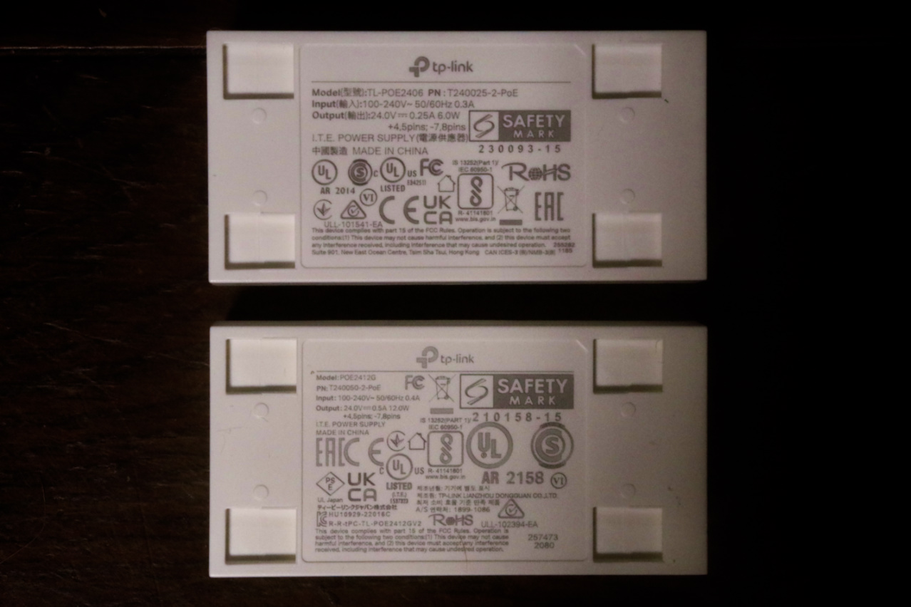 もう既に上で述べましたが、この画像の左側がTP‑Link EAP110 Access Pointに付属していたPoE給電アダプターで、右が上に紹介しているTP‑LinkTL-POE2412G(UN) 24V Passive PoE Adapterです。