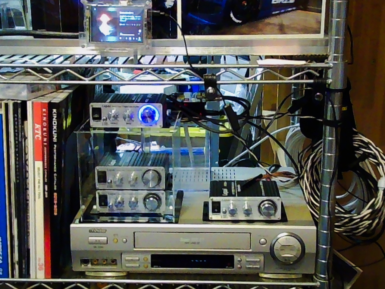 まず一段上の棚にはOsoyoo 3.5inch monitor + Raspberry Pi 4 model B 4GB PC のデバイス、そして元々このスペースはこのために確保したようなものですが、一番下にまるで舞台のように横たわる、Victor HR S200 S-VHSビデオデッキがあります。